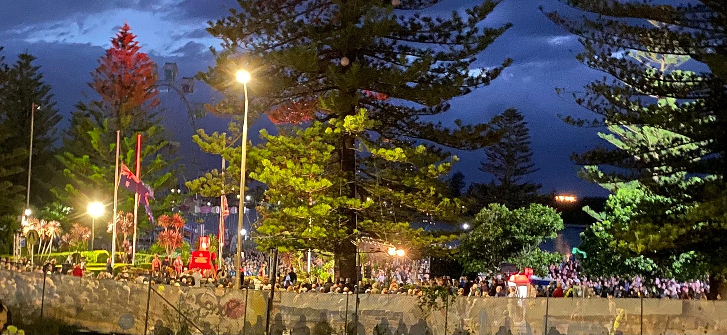 I dragged myself out of bed in the pitch black to go the ANZAC day dawn service. I don’t entirely understand my motivation for going. I won’t subject you to dubious conjecture. I felt moved to go. I wasn’t alone. Couldn’t get a park anywhere near. Made it just in time to get a hilltop possie outside the park. A bloke who’d been attending for sixty years said he’d never seen so many people.